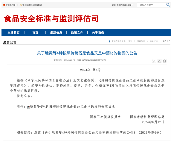 2024年8月26日,國家衛(wèi)生健康委員會(huì)、國家市場(chǎng)監(jiān)督管理總局聯(lián)合發(fā)布公告,決定將地黃、麥冬、天冬、化橘紅...