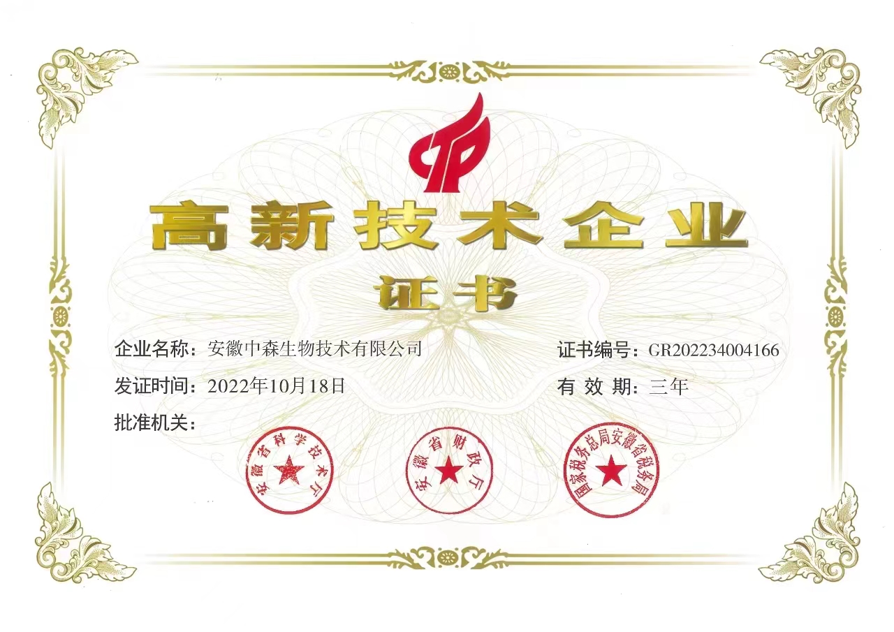 2022年10月18日,安徽中森生物技術(shù)有限公司榮獲國(guó)家級(jí)高新技術(shù)企業(yè)認(rèn)證。