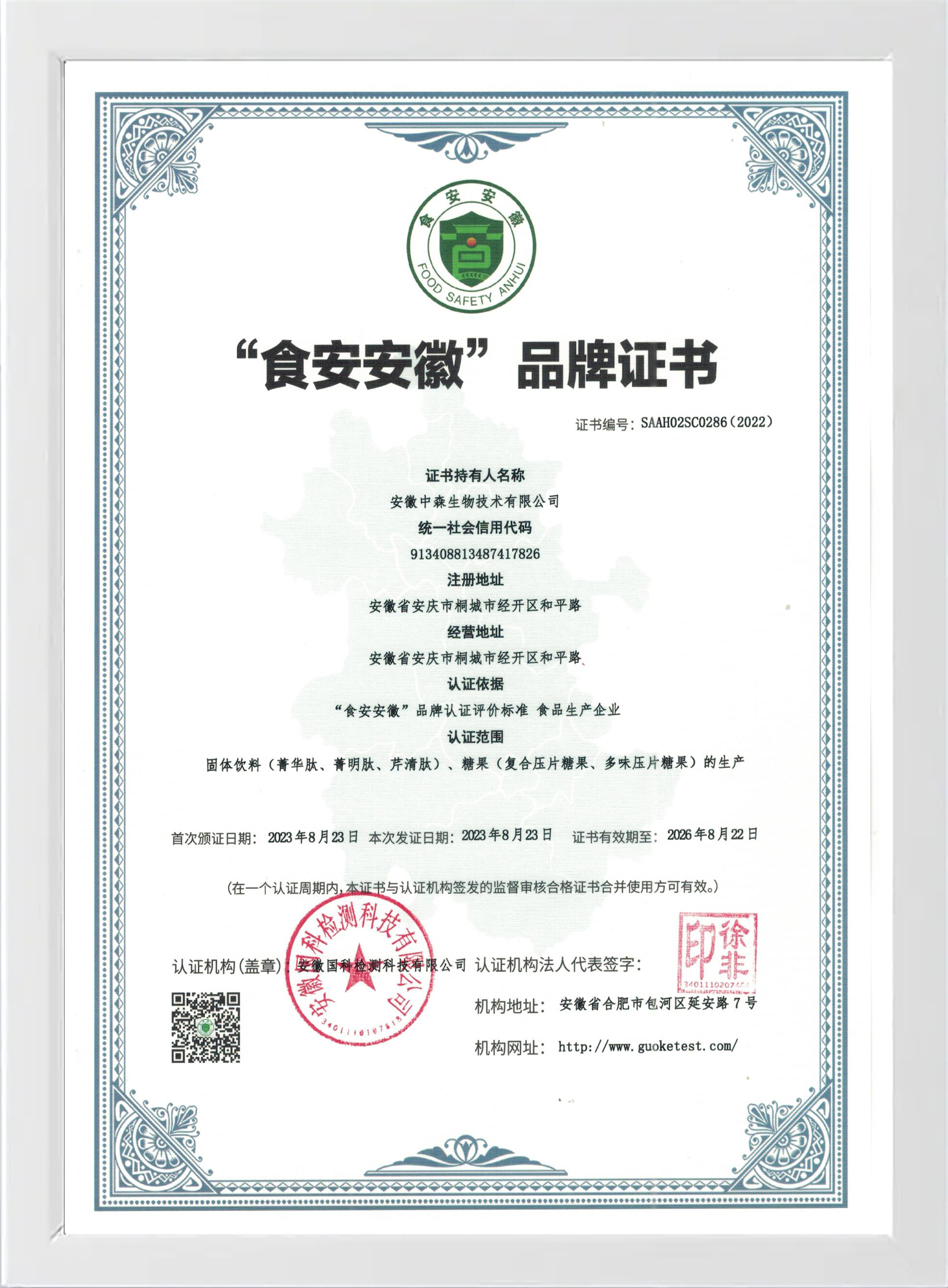 2023年8月23日,安徽中森生物技術(shù)有限公司獲得“食安安徽”品牌證書(shū),認(rèn)證范圍為:固體飲料(菁華肽、菁明肽、芹清肽)、糖果(復(fù)合壓片糖果、多味壓片糖果)的生產(chǎn)。“食安安徽”品牌認(rèn)證證書(shū)是安徽省目前食品領(lǐng)域唯一的、最高的品牌,是企業(yè)拓展外地市場(chǎng)的“官方通行證”,也是安徽食品走向世界的一張文化名片。